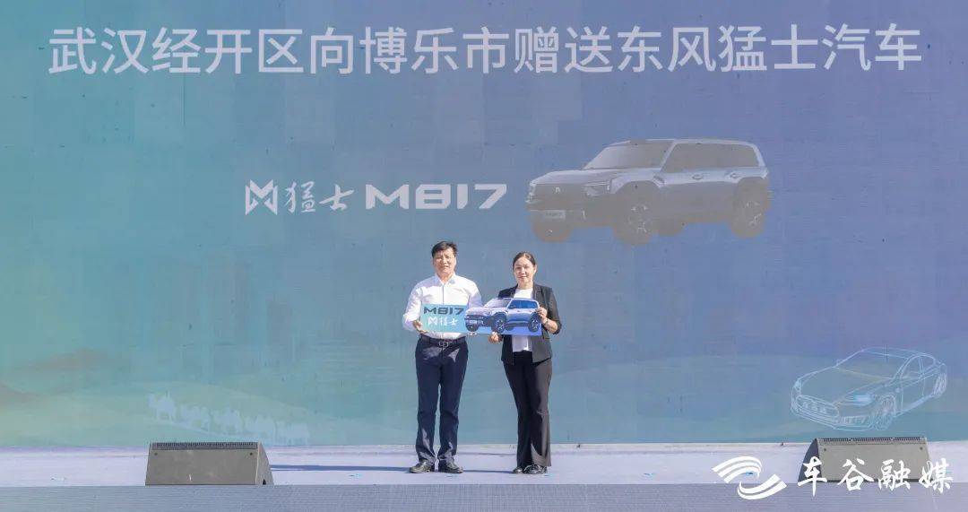 现场,武汉经开区还向博乐边合区赠送猛士M817。此外,猛士917、全新岚图梦想家、岚图FREE+、东风风神L8等多款“武汉造”“车谷造”新能源汽车集中亮相,吸引不少博乐市民围观体验。
