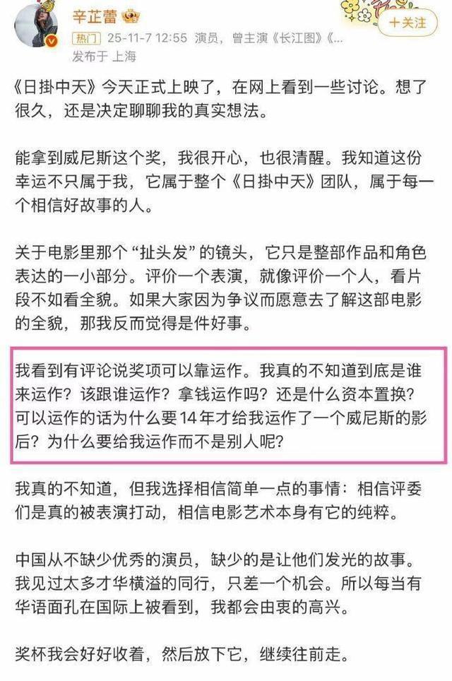 郝蕾直言“现在拿奖都靠扯头发表演吗?”虽然并没有直接点名,但结合《日掛中天》当中辛芷蕾的表演桥段,让大家推断郝蕾的矛头直指的就是《日掛中天》以及辛芷蕾。